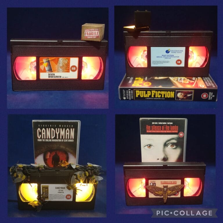 Hi everyone my name is Clare and I recycle VHS into funky geeky nightlights. Remember going to blockbuster and choosing a film? I want to bring those memories back. All VHS are the genuine product. Sometime they come with extras from the film