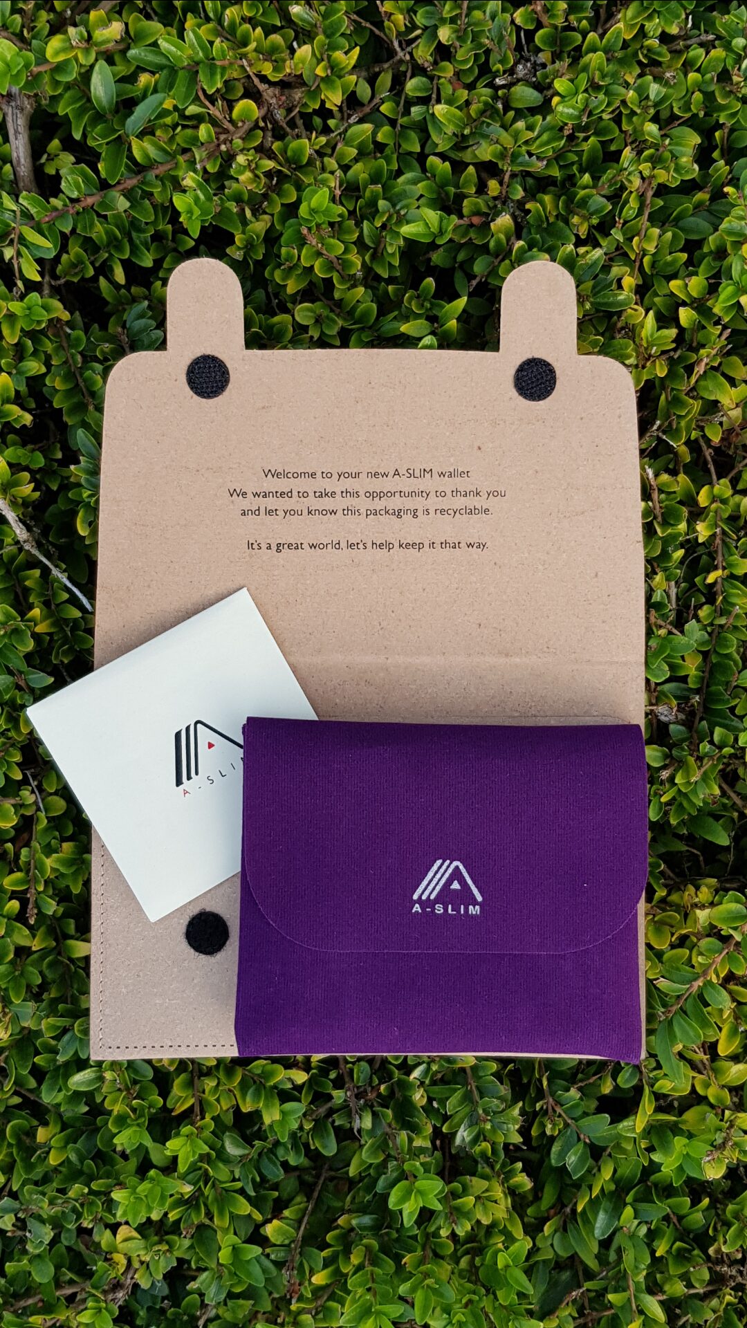 The “Origami” wallet comes in a very fine envelope, with the “A-Slim” logo centred on the envelope. I couldn’t put my finger on the materials used to make the envelope, as it felt like leather, smelt like leather but didn’t look like leather. Upon contacting A-Slim, I discovered that they use all their leather cutoffs and recycle them into their envelopes. This is amazing, as it reduces waste. Instead of using glue to stick the edges, it has been stitched with cream coloured thread. There are two circular Velcro fittings that prevent the contents from falling out. Inside the envelope, you receive another envelope. This one is made from a soft, purple fabric containing a card with information about the product and a note from A-Slim, thanking you for your purchase. In this purple envelope, you will also find the most important part – the “Origami” wallet.