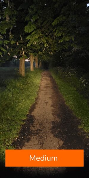 - Medium: 350 Lumens, 3.5 hour runtime, 160M distance, 6400 Candelas (cd).