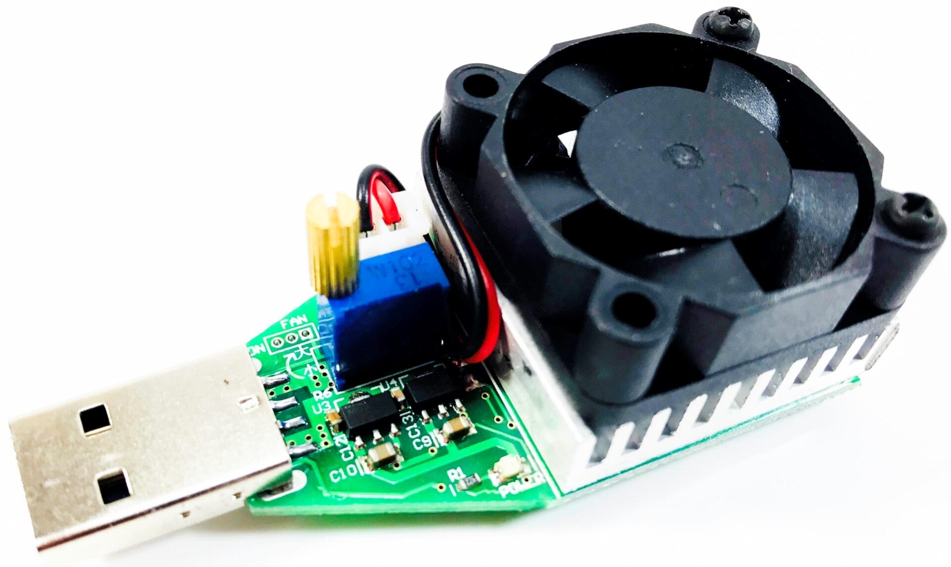 The second part is the USB Electronic Load, this measures 6.5cm x 3.0cm x 2.0cm and has a USB-A male plug end and features a potentiometer and a little DC brushless fan for heat displacement.