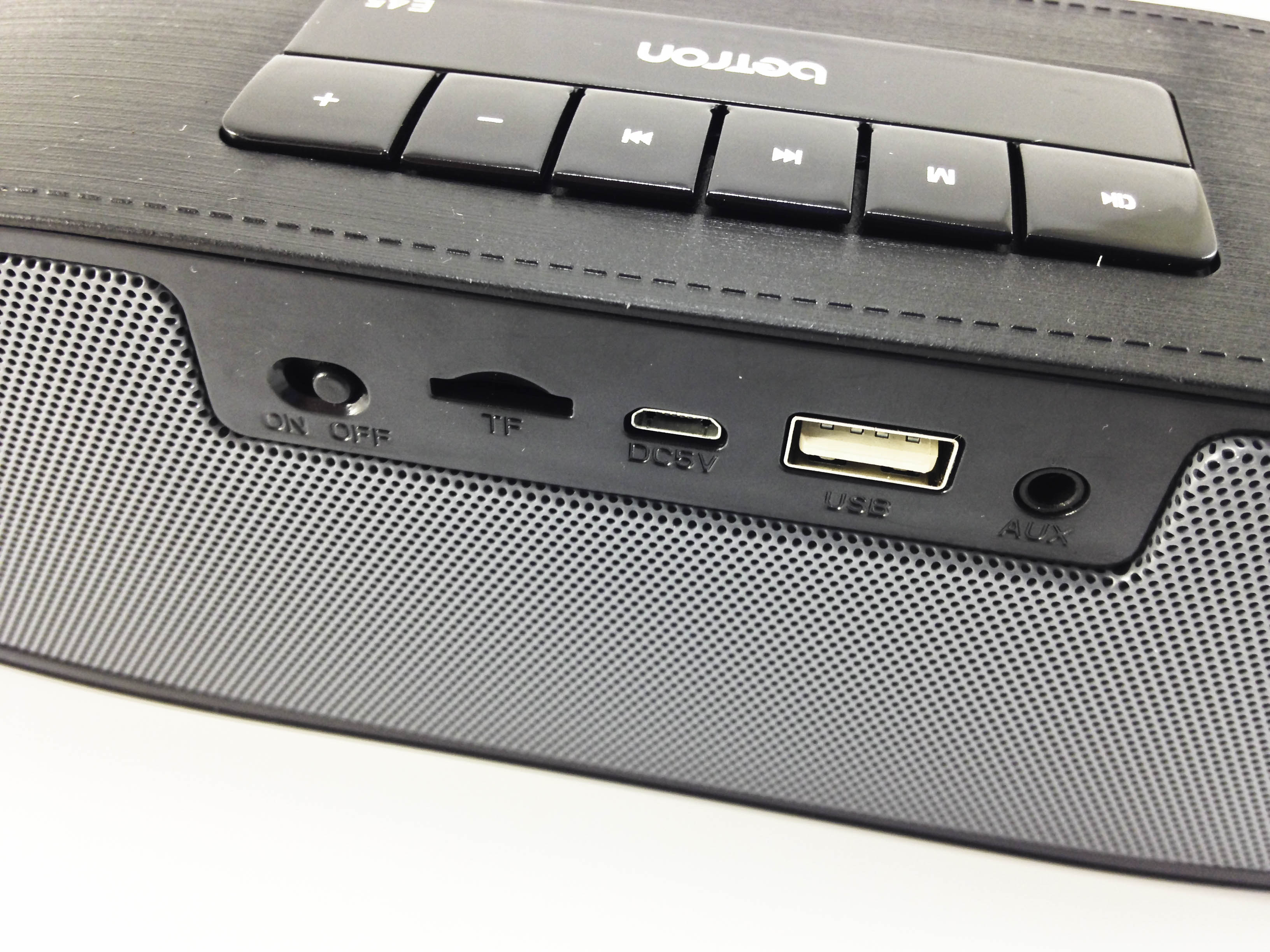 On the back of the Betron E45 there are 5 function control input slots, these are from left to right, Power On/Off Toggle Switch, TF Card Input, Micro USB Charging Port, USB Port, and AUX Port.