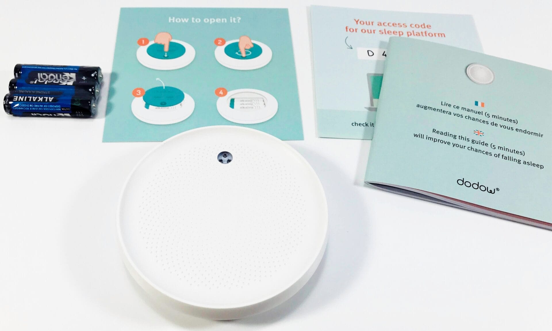 Upon opening the Dodow box you’ll find the following items. 1x Device, 3x AAA Batteries, 1x Battery Installation Guide, 1x Code for the Sleep Platform, 1x French/English User Guide.
