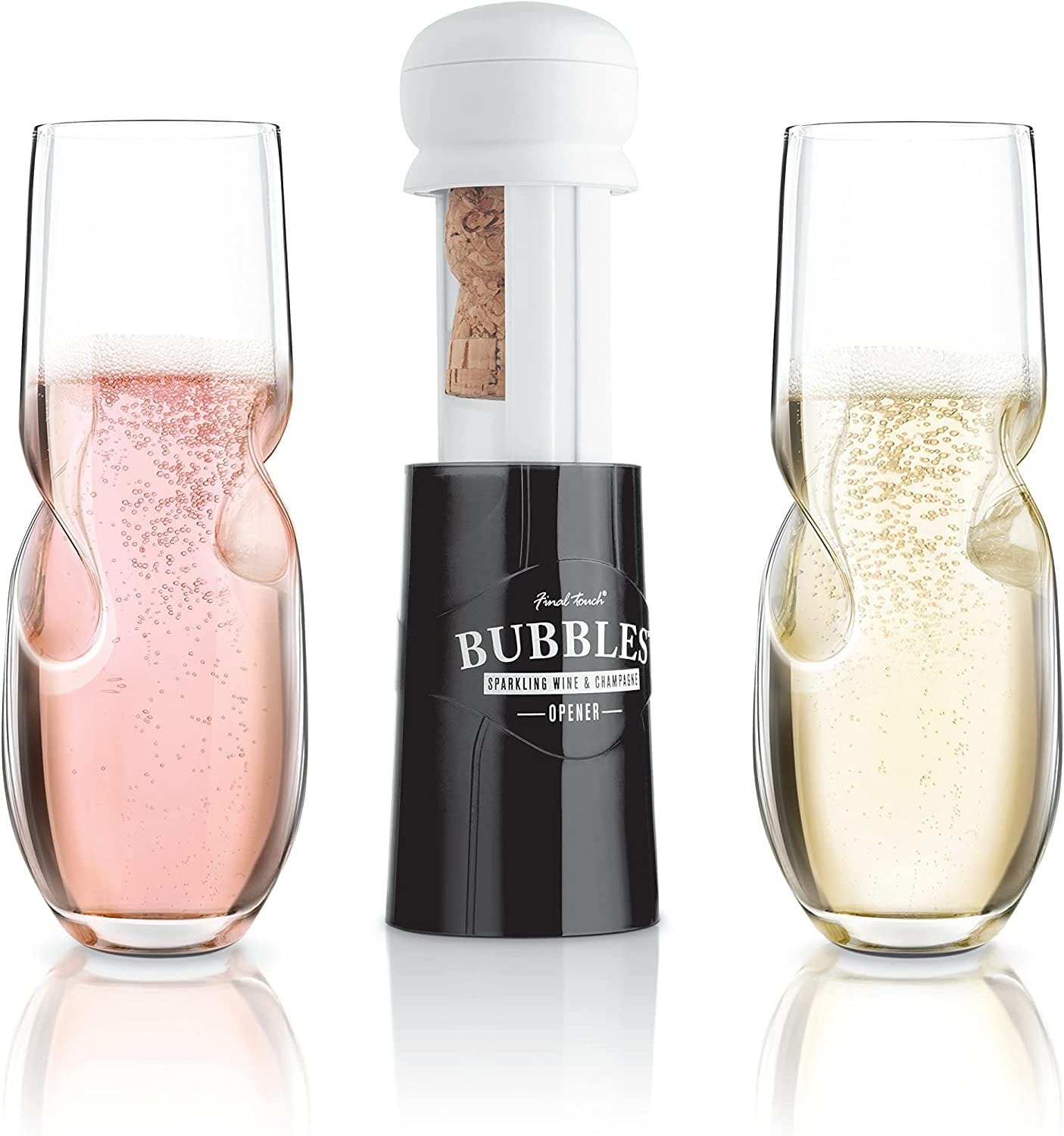 I love the Final Touch Bubbles Glasses. The shape is unique and helps provide grip whilst you guzzle a cold fizzy drink. The cork opener was also very impressive, easy to use and simply remove the cork once popped. I couldn’t find any issue or faults with either the glasses or opener.