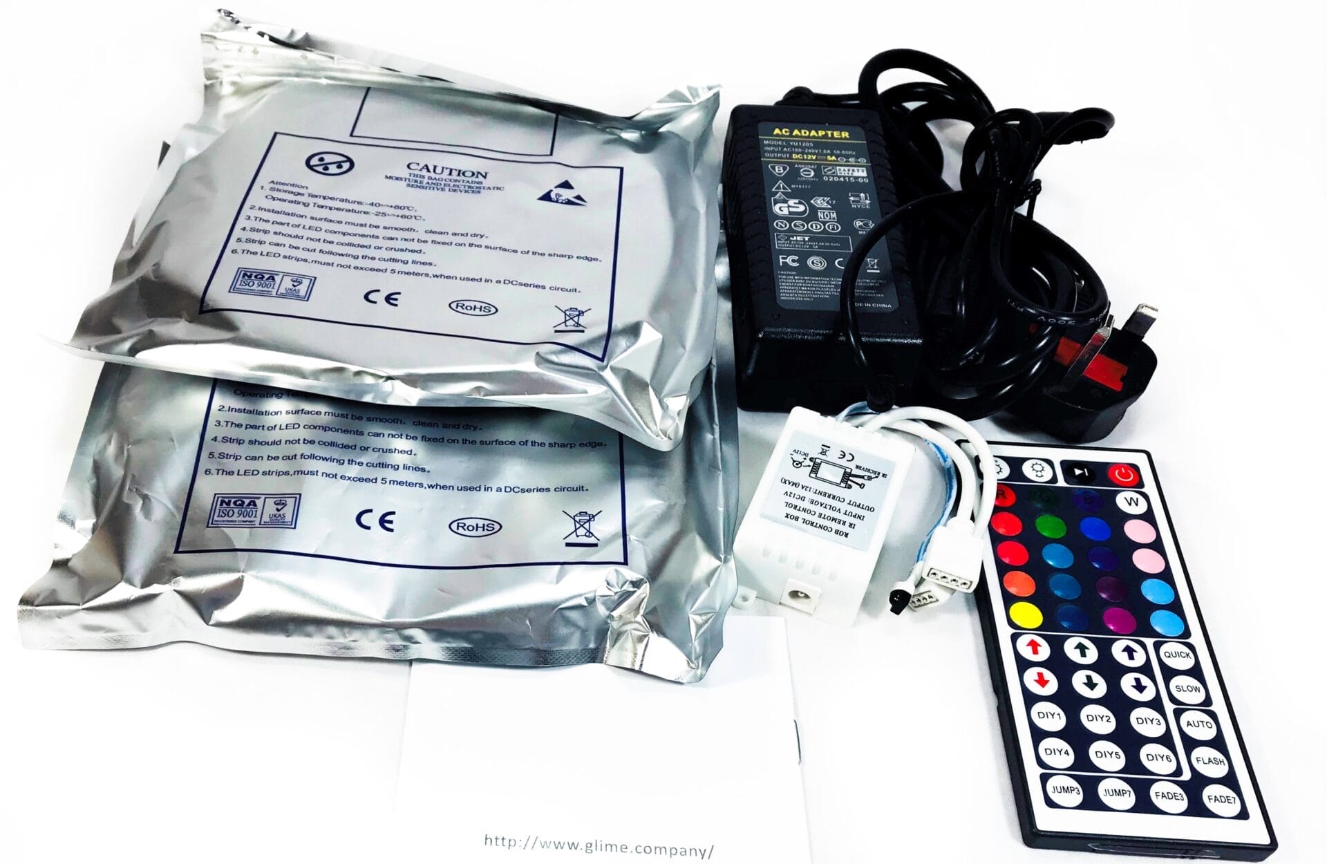 The GLIME LED Strip Light comes as two separate 5M cable reels and packaged in anti-static packaging. Each reel contains 300 RGB 5050 SMD LED’s.