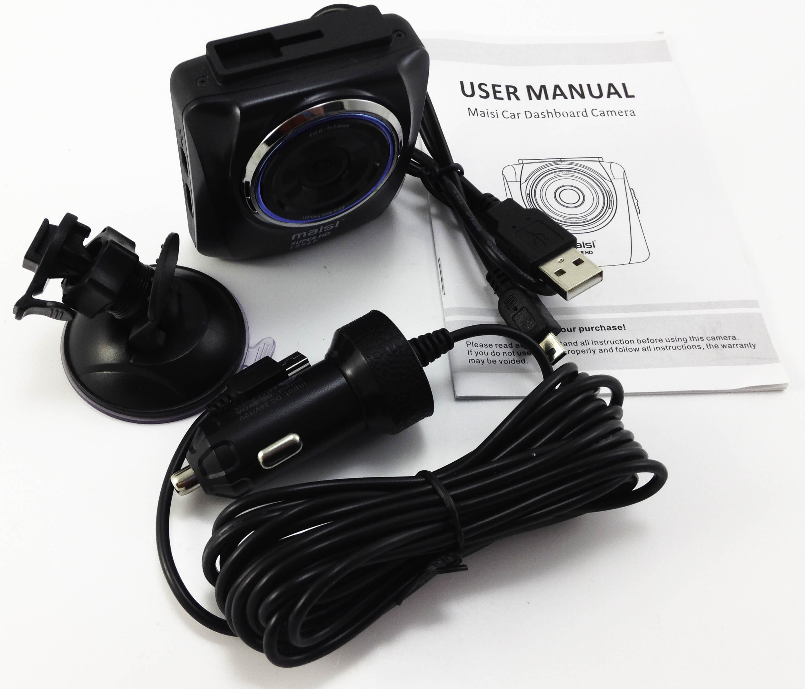 Upon opening the Maisi M85 box you’ll find the following items: 1x Dash Cam, 1x Car Charging Cable, 1x USB Cable, 1x Windscreen Bracket, and a set of English user instructions.