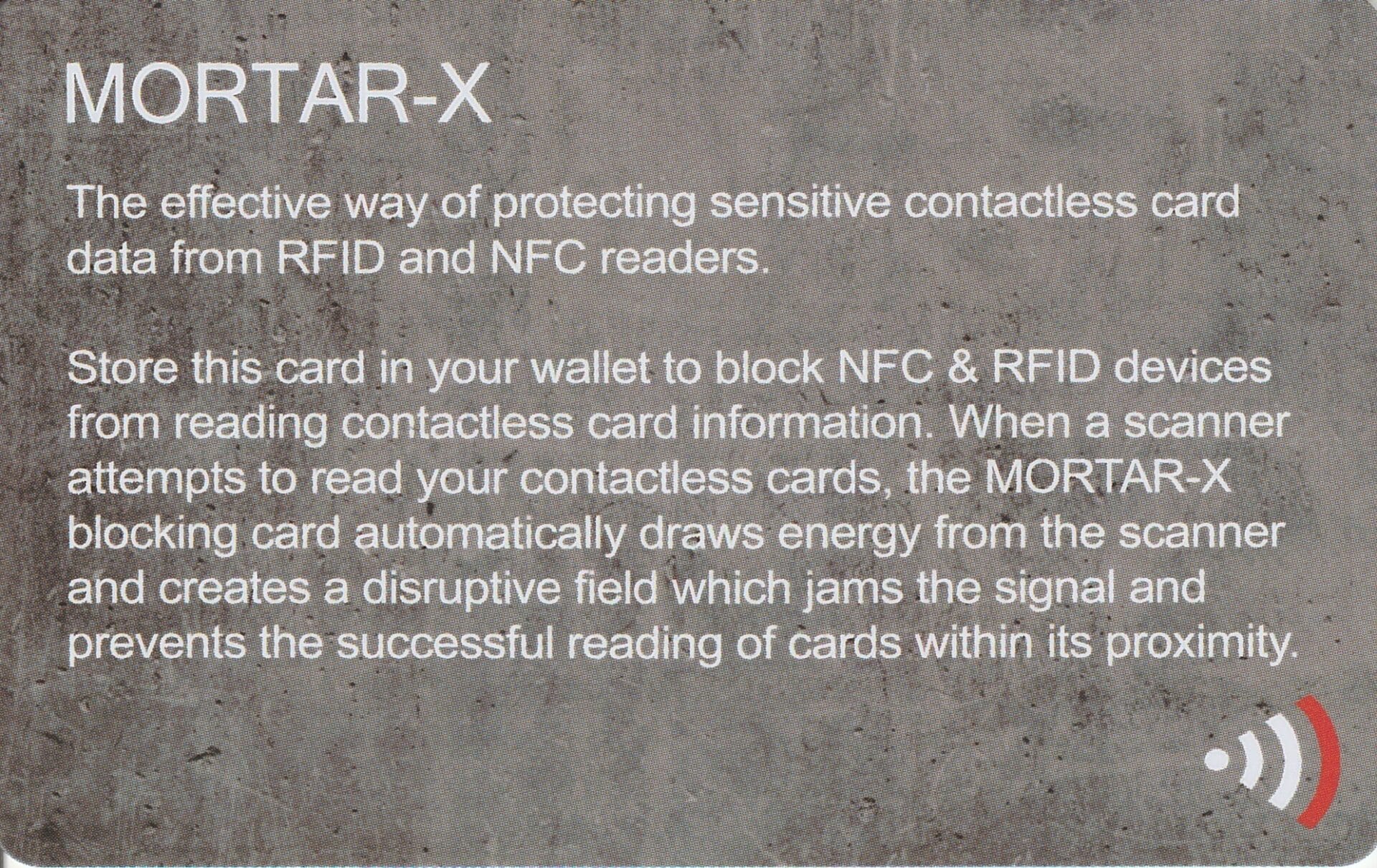 The MORTAR-X is basically a protective forcefield that protects not only contactless cards, but ID Cards, Biometric Passports, NFC-Enabled Mobile Phones, and Key Cards/Fobs & Entry Cards.