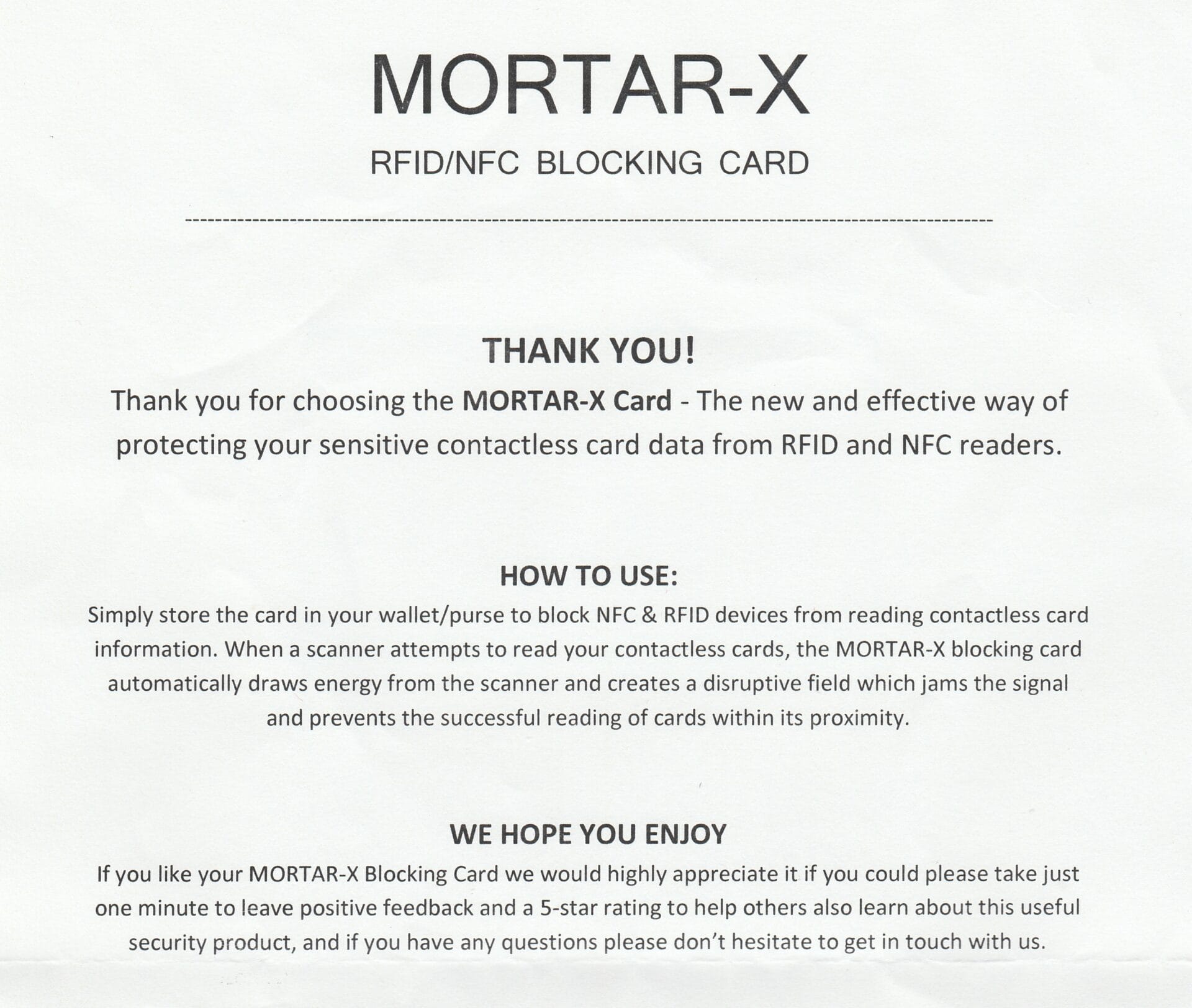 The MORTAR-X RFID NFC Blocking Card comes packaged inside a White mailing envelope with an added A4 paper company usage instruction.