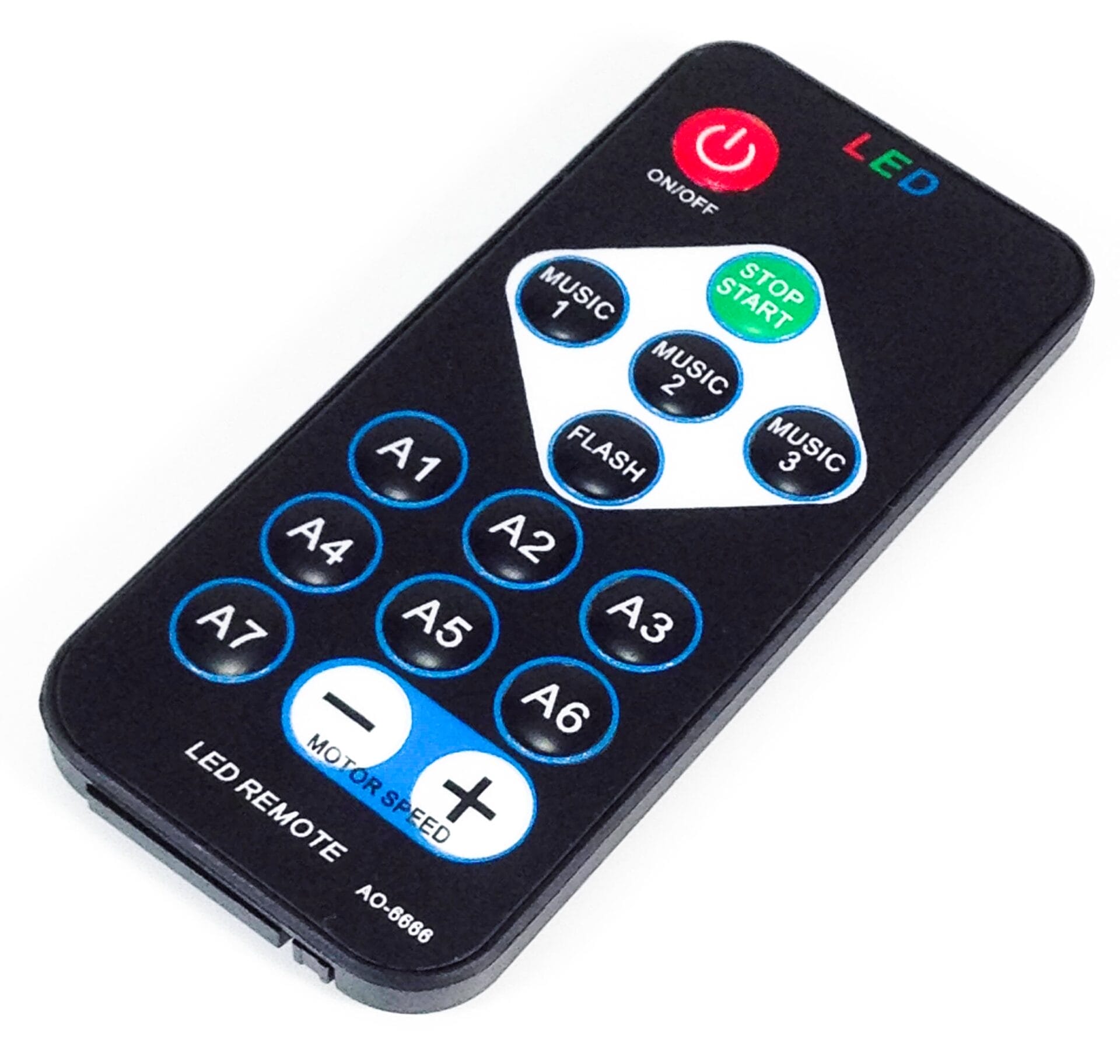 You get a remote control too, this remote allows you to turn on/off your light, change the light patterns, change the motor speed, and turn on the strobe light setting.