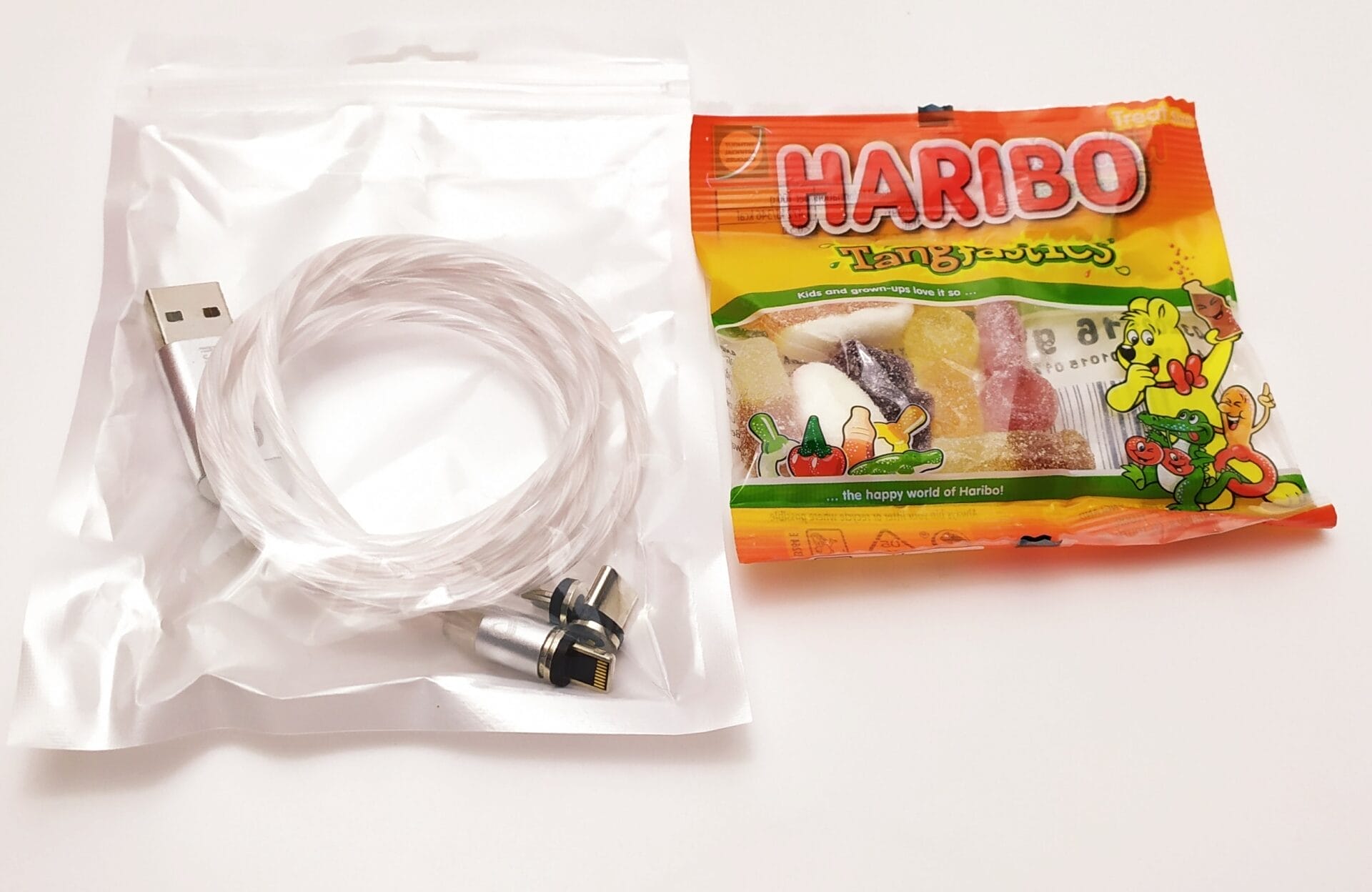 The Subbytech Disco Charging Cable comes packaged in a plain looking bag. But Subbytech do throw in an extra gift of a packet of Haribo, which I think is unique. Also, the outer envelope that gets posted to you features a special image/theme. I’d show you it, but I’d end up publishing my PO Box and personal address over the internet.