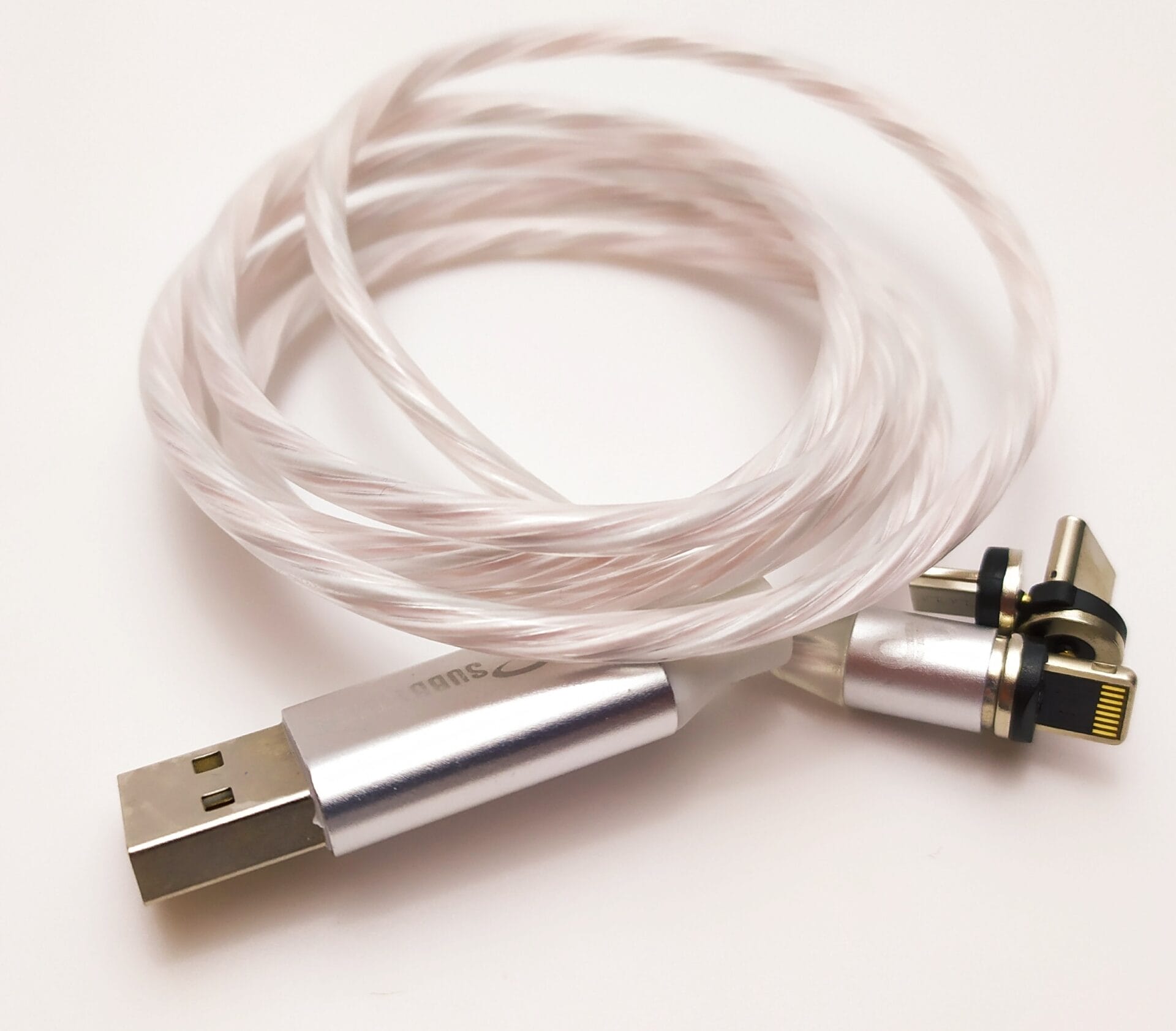 The Subbytech Disco Charging Cable is made from TPE (Thermoplastic Elastomers) which means it’s both flexible but also durable. It’s has a white/opaque finish to it and upon looking closely into the cable you’ll see multiple LED cables. This is where the magic happens. The cable measures 1M in length and features a standard USB plug on one end and a magnetic receiver on the other.