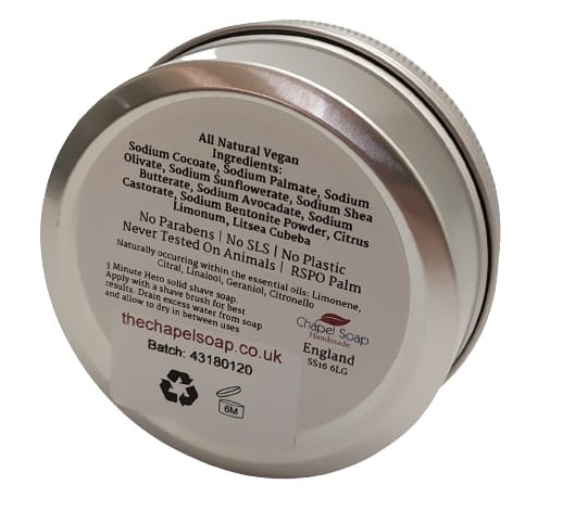 The Chapel Green Shaving Soap is sent in 100% plastic-free packaging. Not a single trace of plastic, not even sticky tape. The outer tin is 100% recyclable and features some knurling to the edge for grip too. Each tin measure 8.2cm x 3.5cm and weigh around 120G (including soap and tin, the shaving soap weighs 100G).