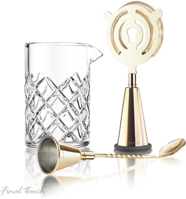 Today I’ll be reviewing the Final Touch Cocktail Mixing Set. A high-quality all in one mixology set from drinkware giftware company Original Products. This is a high-end cocktail set with brass plated instruments and a heavy glass mixing pitcher.